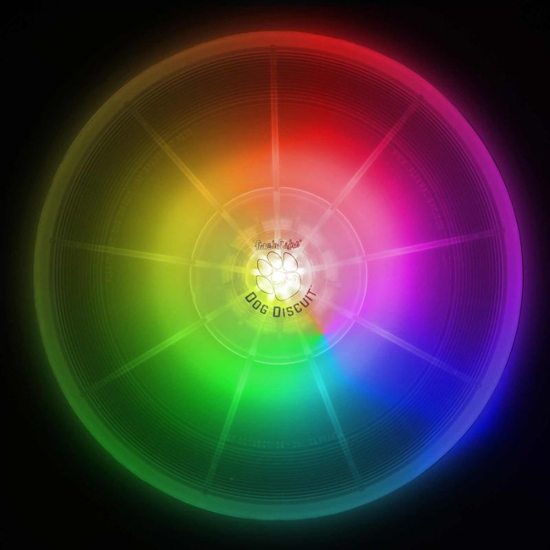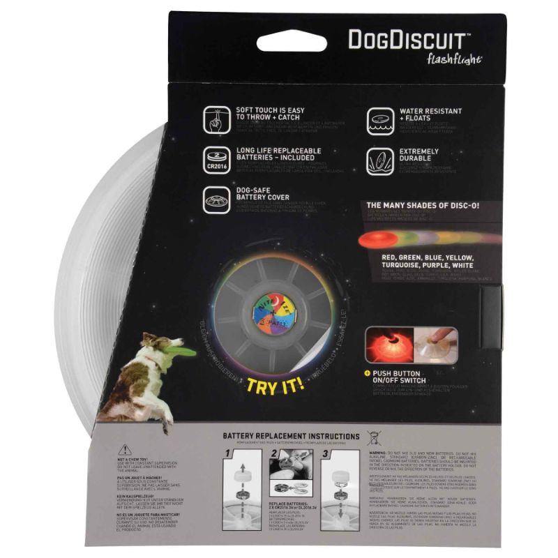 Designed for superior flight, our FlashFlight LED Dog Discuit is a soft-touch plastic flying disc made specifically for nighttime play with your disc-loving dog. It’s illuminated by a super-efficient, long-lasting LED, so it glows brightly in the dark. The Dog Discuit is not only super fun, it’s mouth friendly, bite durable, and has a canine-resistant cap that helps prevent dogs from chewing off the battery and LED housing. Available in our fun, colour-changing Disc-O LED, the Dog Discuit comes with two replaceable, long-life batteries, for endless seasons of fun under the stars.