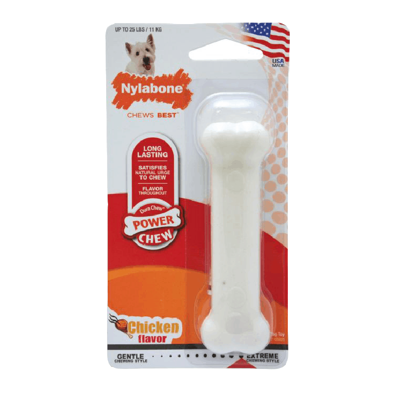 Made with tough, durable nylon, the Power Chew DuraChew Chicken Chew Toy was designed for your powerful chewer. It provides long-lasting enjoyment, satisfies your dog’s natural urge to chew, and encourages positive chewing habits. Plus, the bristles raised during chewing promote clean teeth and help control plaque and tartar buildup. Go ahead and give your dog a Nylabone! Made in the USA!