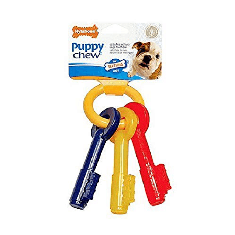 Nylabone Teething Keys Puppy Chew Toy is made with soft, puppy-friendly material to satisfy the chewing needs of teething pups and encourages positive chewing habits from a young age. Plus, the bristles raised during chewing help clean teeth and prevent tartar buildup. The perfect puppy teething toy for pups who love to chew! (This chew toy is not for puppies with adult teeth or for powerful chewers.)