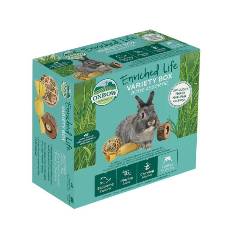 Oxbow Enriched Life Variety Box For Small Animals consists of 1 small Flip & Roll, 1 Timothy Surprise and 1 Rattan Ball.