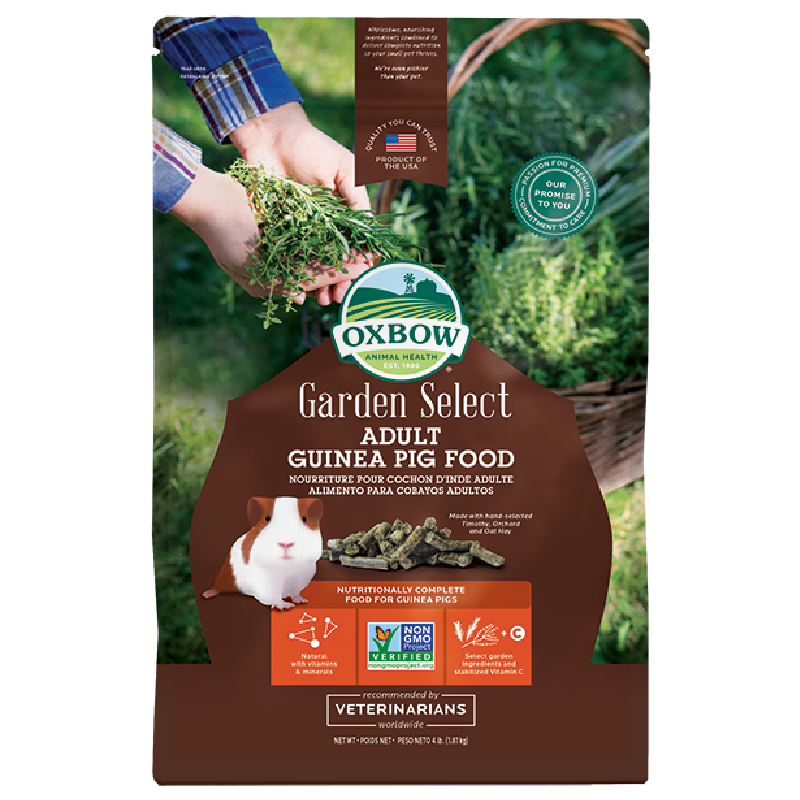 The guinea pig food with the garden fresh flavor and aroma!  Garden Select Adult Guinea Pig contains all of the complete nutrition you’ve come to expect from Oxbow, with a flavor profile hand-picked from Mother Nature’s kitchen.  Select garden ingredients such as whole yellow pea, tomato, rosemary, and thyme give Garden Select its delectable, garden fresh flavor while a blend of three varieties of hand-selected hay provides the fiber your pet needs while encouraging enrichment and variety.  All Garden Select varieties are Project Non-GMO certified.