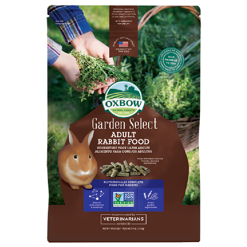 Complete, balanced, and bursting with garden fresh flavor and aroma.  Garden Select Adult Rabbit contains all of the complete nutrition you’ve come to expect from Oxbow, with a flavor profile hand-picked from Mother Nature’s kitchen.  Select garden ingredients such as whole yellow pea, tomato, rosemary, and thyme give Garden Select its delectable, garden fresh flavor while a blend of three varieties of hand-selected hay provides the fiber your pet needs while encouraging enrichment and variety.  All Garden Select varieties are Project Non-GMO certified.