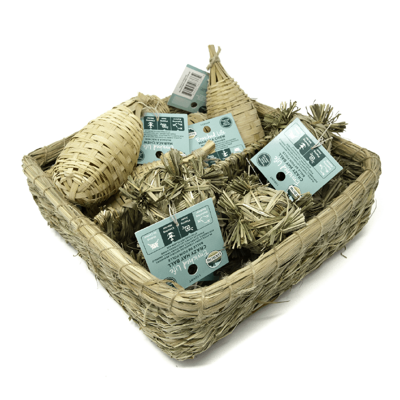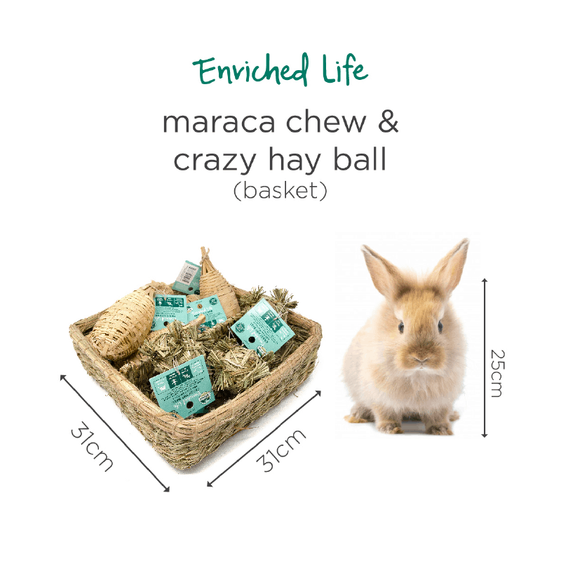 Oxbow Enriched Life Maraca Chew and Crazy Hall Ball Baskets consist of 6 hall ball and 1 vine basket. It helps to support your pet’s instinctual behaviors such as exploring, playing, hiding, and chewing. Oxbow Enriched Life is designed with these natural behaviors in mind and is constructed from 100% pet-safe materials, allowing you to nurture your pet’s mind and body in safe and fun ways every day.