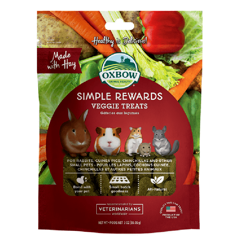 From the garden to your pet – veggie goodness from Oxbow Animal Health! The wholesome, oven baked blend of vegetables and greens in Oxbow Veggie Treats translates into a tasty, enriching reward for your pet. Our treats provide the nutritional balance animals would find in their natural habitats and help add healthy variety to your pet’s diet. Simple Rewards allows you to give your animal a healthy, delicious treat you can both feel good about.