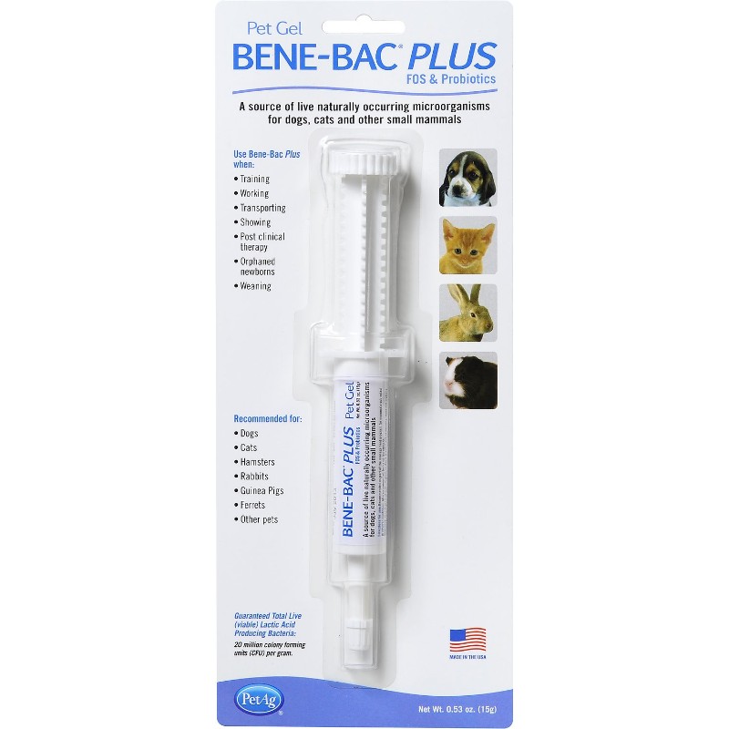 Bene-Bac® Plus Pet Gel is a palatable gel in an easy-to-use, 15-gram syringe or 1-gram tube containing concentrated FOS and live, naturally occurring microorganisms. Bene-Bac® Plus Pet Gel is recommended any time an animal experiences changing nutritional or environmental conditions.