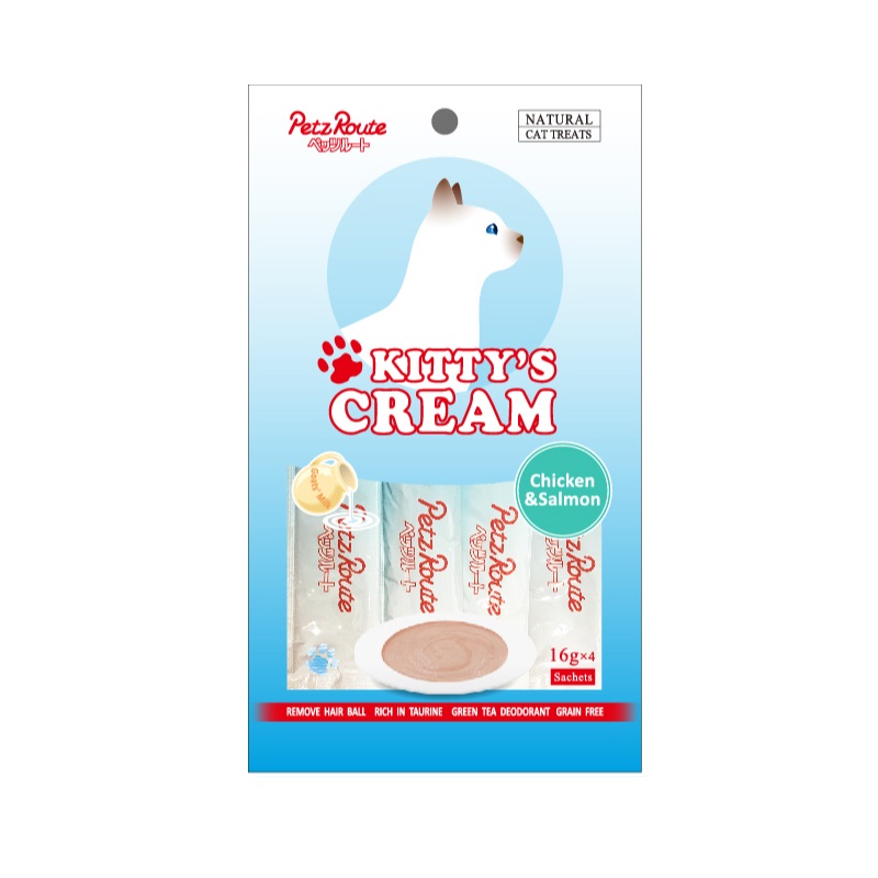 Petz Route Kitty’s Cream Chicken & Salmon are a grain free wet treat for cats. It contains glocosamine and chondroitin sulfate to promote the health of your cat’s joints and bones. It contains added potassium citrate to aid the urinary health of your cat.