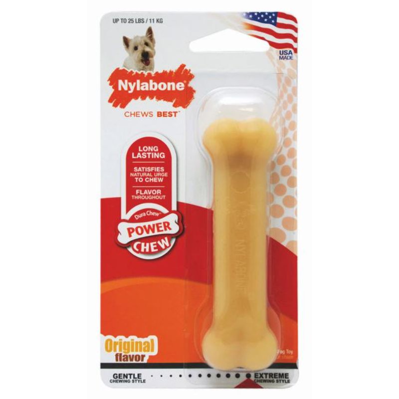 Made with tough, durable nylon, the Power Chew DuraChew Original Chew Toy was designed for your powerful chewer. It provides long-lasting enjoyment, satisfies your dog’s natural urge to chew, and encourages positive chewing habits. Plus, the bristles raised during chewing promote clean teeth and help control plaque and tartar buildup. Go ahead and give your dog a Nylabone!