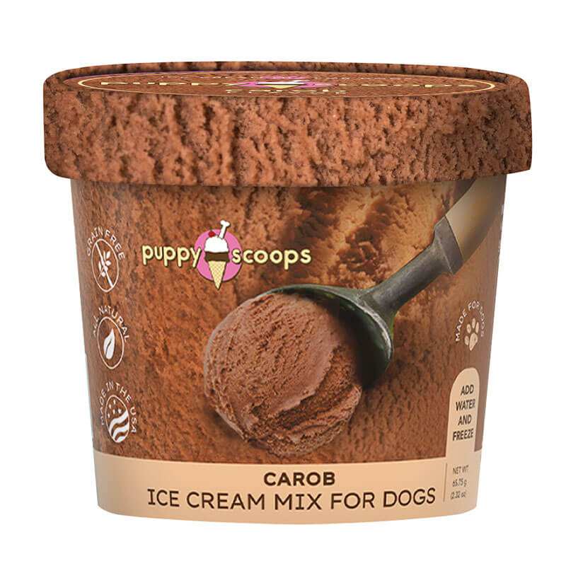 Everyone knows that dogs can’t have chocolate or so we thought but now they can! Carob is a natural chocolate substitute that is completely safe for dogs to consume. Our Carob flavored Puppy Scoops is rich, creamy and smooth, which will have your dog begging for more. A pint of Puppy Scoops in any flavor is the perfect gift for dog lovers and pet parents who have dogs and want to feed them exceptional dog food. Dog birthdays should be celebrated with cake and ice cream treats! Puppy Scoops is the perfect dog ice cream recipe for ice treats for dogs that deserve the very best! Just add water, freeze and enjoy!