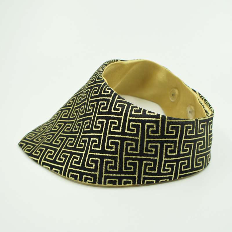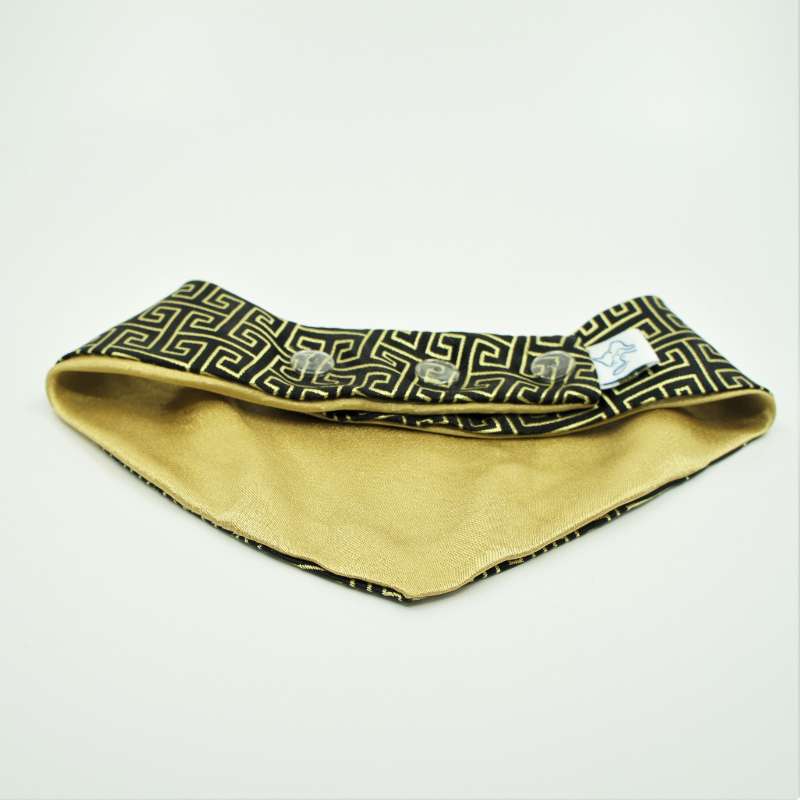 Our Bandana is soft, comfortable and gentle on your pet. Each piece is made of high quality Silk Satin Brocade with a layer of soft interfacing. The main fabric design is Golden patterns on a black background to enhances the overall look. The golden patterns make the bandana looks elegant. (Gold symbolizes affluence, material wealth and extravagance. Black is the color of the hidden, secretive and unknown. Both colors combined to create an air of mystery.) The reversible side is Gold. The bandana is secured using snap buttons which and adjustable to fit the pet’s neckline. Easy to maintain. If soiled, just hand wash and lightly iron for a new and neat look. Each piece is handmade and unique. Our bandanas can be worn indoor and outdoor. Your pet will look stylish during CNY.