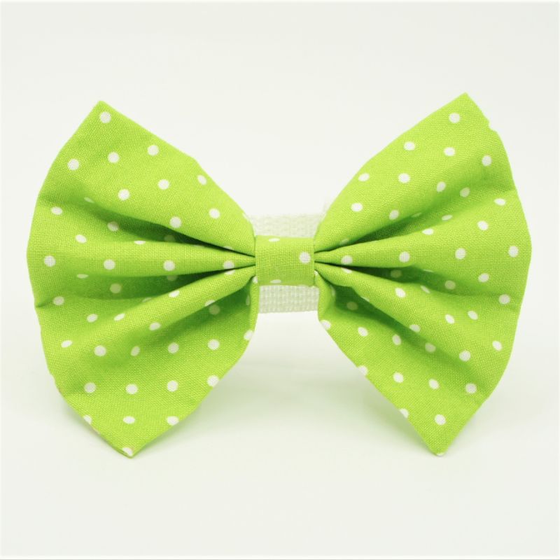 Our Bowtie is made of high quality cotton with white polka dots on lime green background. It has a layer of soft interlacing to provide it with a firm design. Comes with velcro secured on the back and easily attach onto the pet’s collar of different sizes. Easy to wear and velcro is long enough to fit large dogs’ collars.