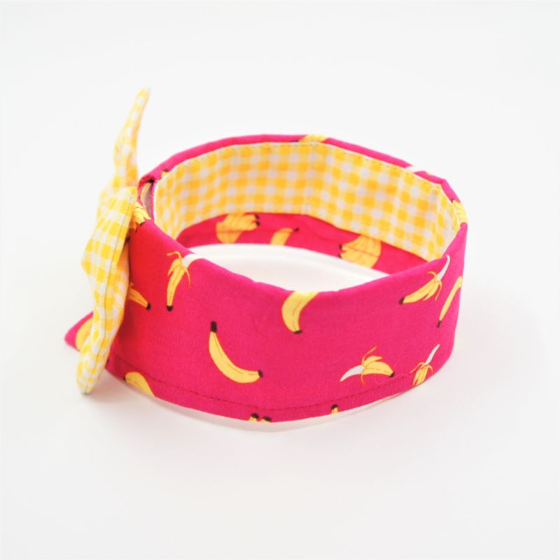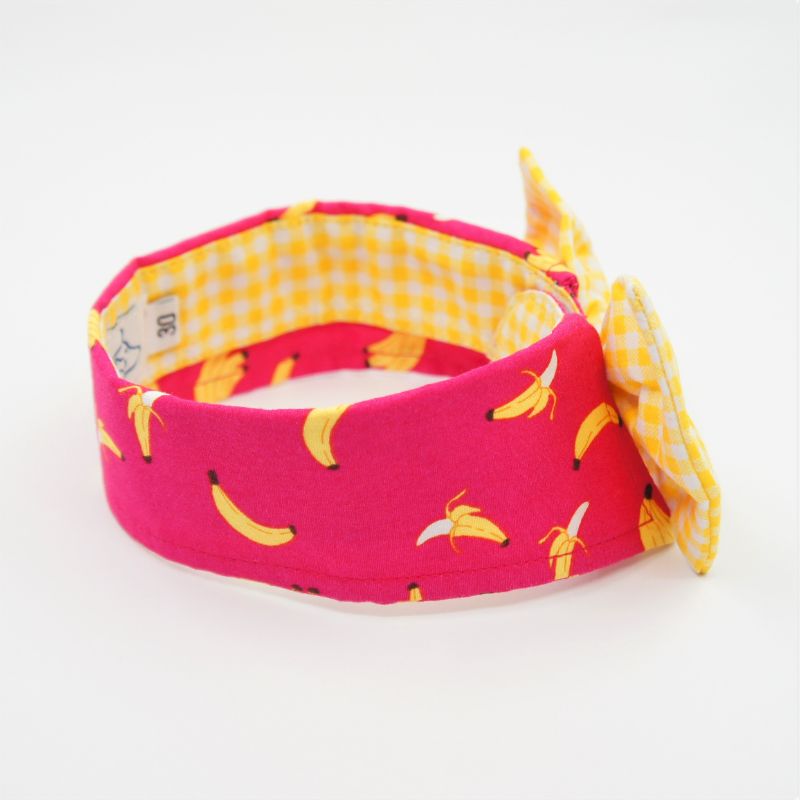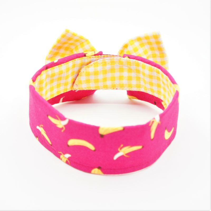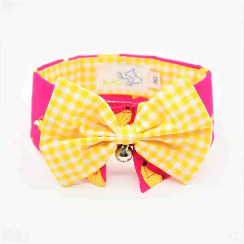 Our collar is soft, comfortable and gentle on your pet. Each piece is made of high quality cotton. The main fabric design is yellow bananas on bright pink background. An accompanying yellow checkered bowtie attached with a silver bell enhances the overall look. The collar is secured using velcro which and adjustable to fit the pet’s neckline. Easy to maintain. If soiled, just hand wash and lightly iron for a new and neat look. Each piece is handmade and unique. Our collars can be worn indoor and outdoor. Your pet will look stylish on all occasions.