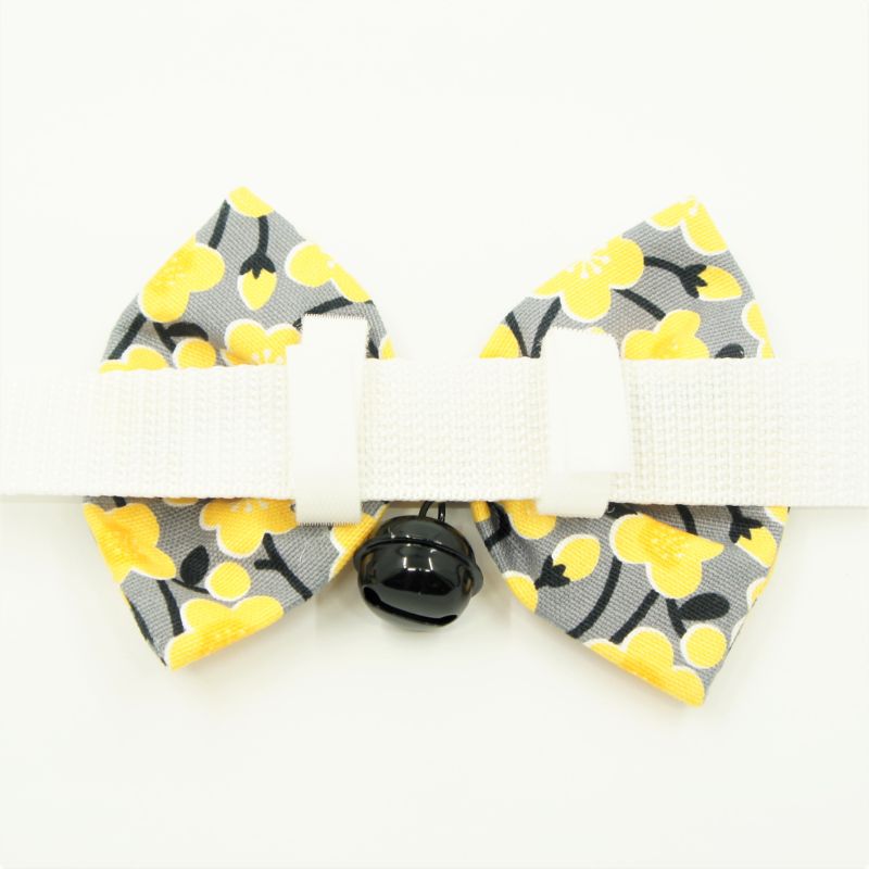 Our Bowtie is made of high quality cotton with yellow flowers on grey background with a black bell attached. It has a layer of soft interlacing to provide it with a firm design. Comes with velcro secured on the back and easily attach onto the pet’s collar of different sizes. Easy to wear and velcro is long enough to fit large dogs’ collars.