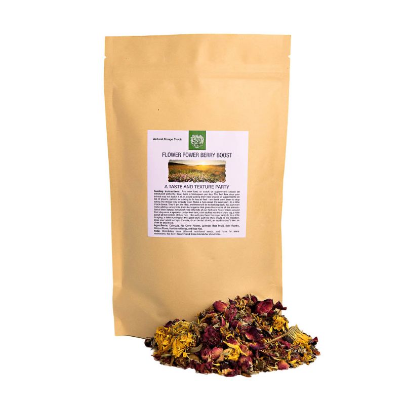 Variety is so important in small animal diets. Rabbits and guinea pigs are natural foragers. They don’t eat only one type of grass, flower, herb, or bark. They eat a little bit of this and a little bit of that. (Depending on what’s seasonally available, of course.) Without diet variety, they can suffer a lack of trace minerals and other nutritional components. Small Pet Select Flower Power Berry Boost herbal blend provides the variety they need to mimic forage.Â