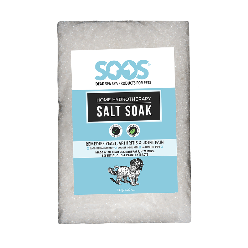 Fill bathtub with warm water and add 4 teaspoons of Soosâ„¢ Dead Sea Mineral Salt Soak for every 5 lbs ( if your dog is 10 lbs add 8 teaspoons). Stir well to ensure that the salt dissolves. Have your pet sit or stand in the bathtub for 20 minutes. Add warm water