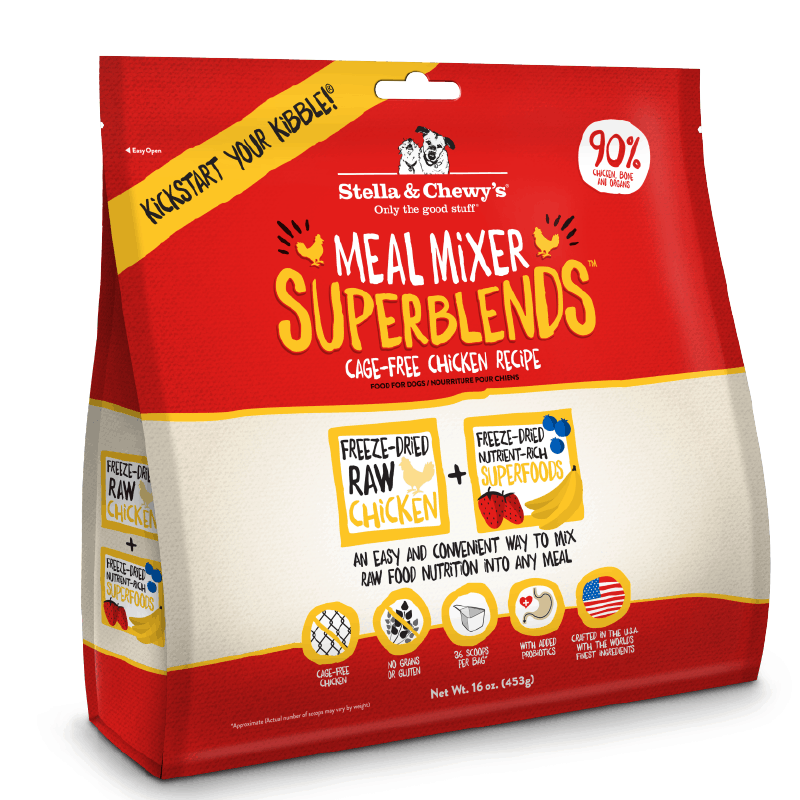 Stella & Chewy’s SuperBlends are an easy and convenient way to mix raw food nutrition into any meal! SuperBlends combine our 95% raw meat Meal Mixers with a special blend of superfoods loaded with healthy nutrients!