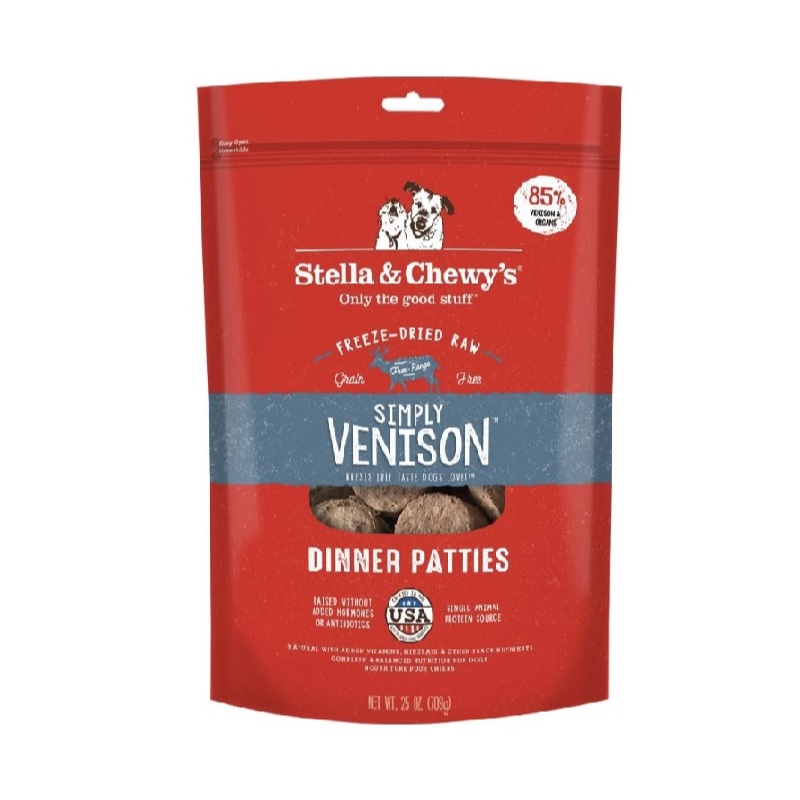Simply Venison Freeze-Dried Raw Dinner Patties is formulated to meet the nutritional levels established by the AAFCO Dog Food Nutrient Profiles. for All Life Stages excluding growth of large size dogs (70lbs or more as an adult).
