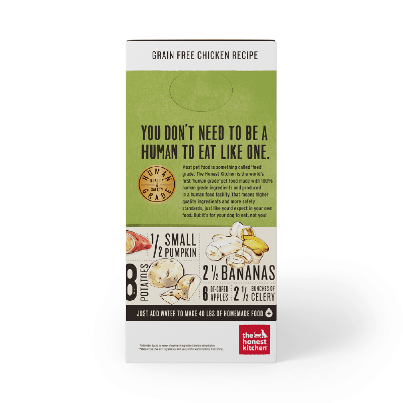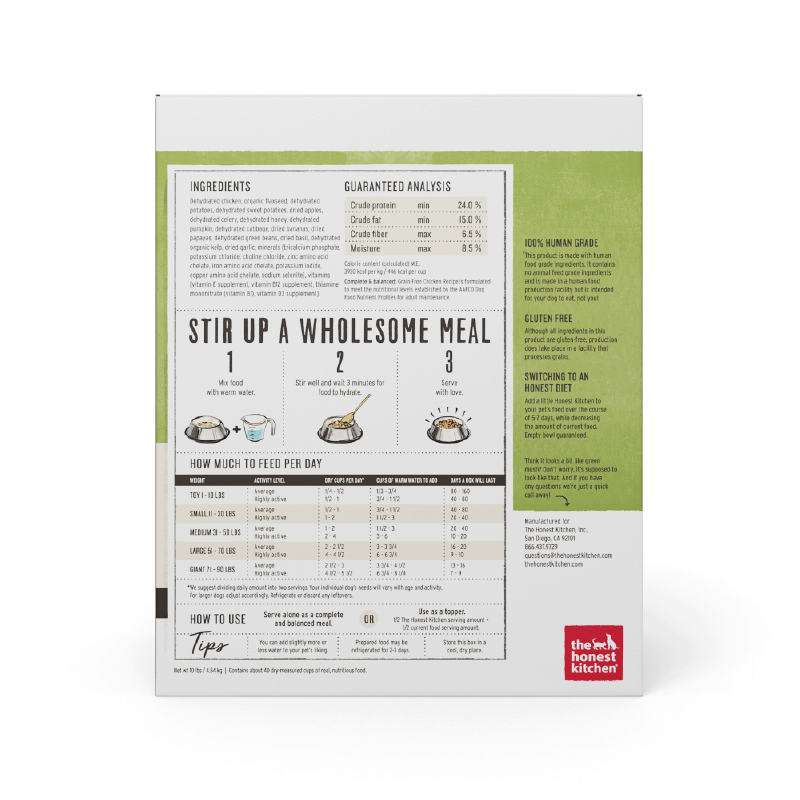 This complete and balanced recipe does the impossible: unites picky-eater-friendly chicken with delicious good-for-them produce—all dehydrated for easy digestibility and enhanced nutrient retention. Low carb, lower calorie, grain free and perfect for adult dogs. This 100% human grade dish is designed for humans, but deserved by dogs.