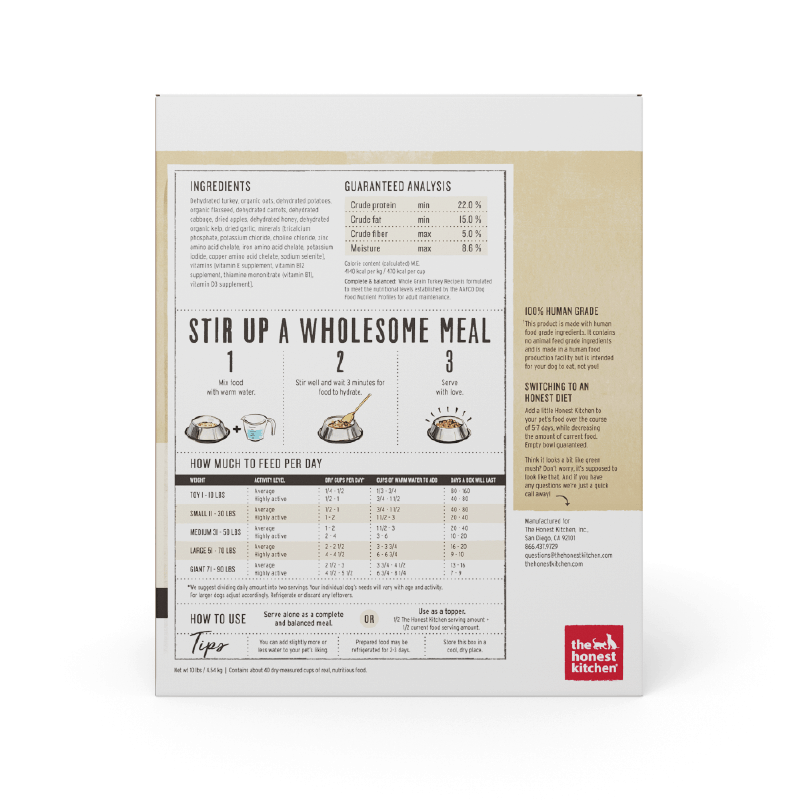 All ingredients dehydrated: Cage free turkey, organic oats, potatoes, organic flaxseed, carrots, cabbage, apples, honey, organic kelp, garlic