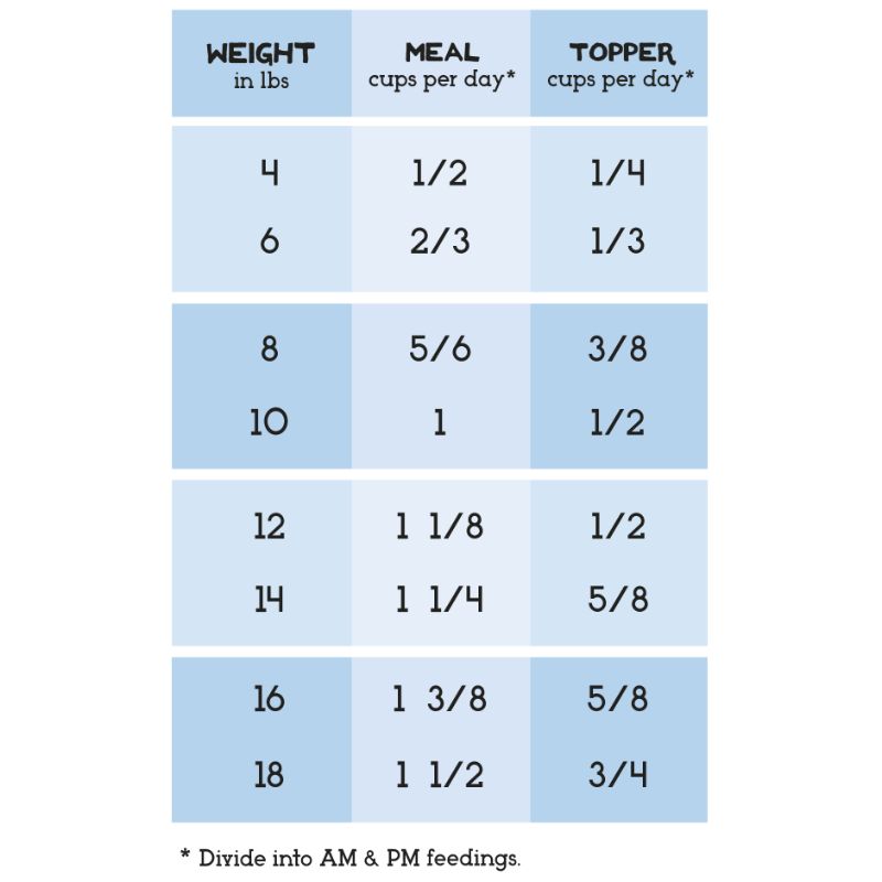 Cats are Individuals with a capital I, so why would their eating habits be any different. Start by using the daily feeding guide below and adjust to your own cat’s needs. We suggest dividing the amount of food into two portions, feeding in both the AM & PM.