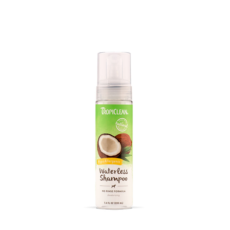 TropiClean Hypo-Allergenic Waterless Shampoo keeps your pet clean and fresh between baths, without the mess and stress of usual bath time. Blended with coconut and aloe to cleanse and deodorize even the most sensitive skin, while being mild enough for puppies and kittens. With no rinsing required you can keep your pet’s sensitive skin fresh and ready to snuggle in less time.