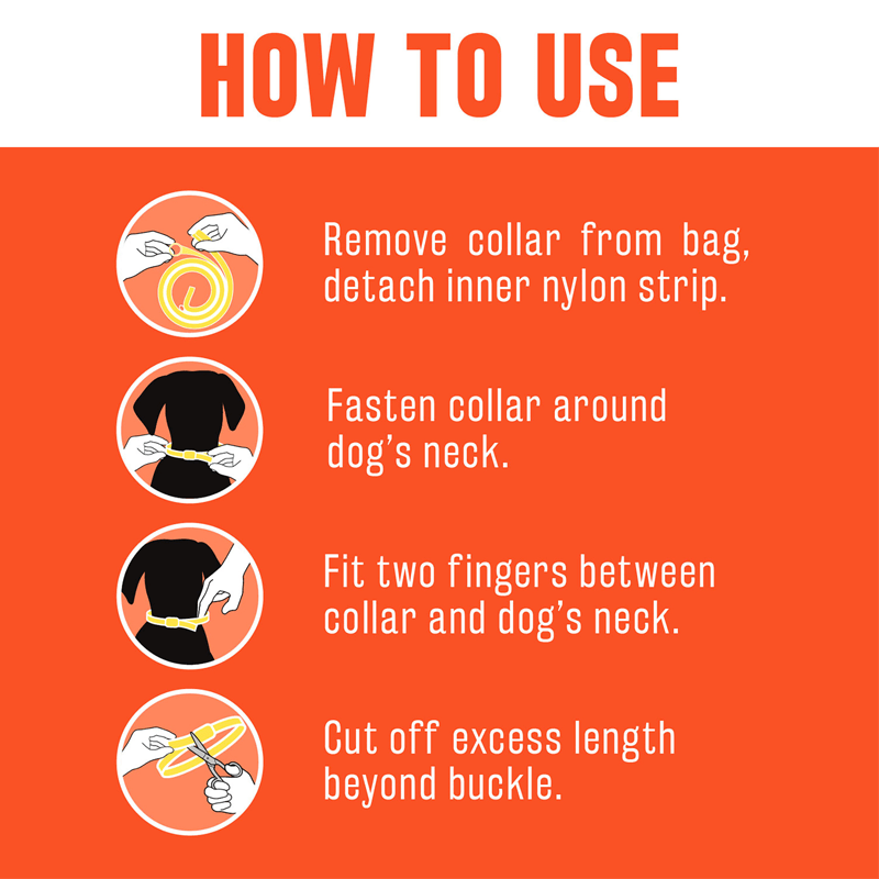 Any excess length of collar beyond the buckle should be cut off and disposed of. Avoid contact with eyes. If contact occurs, rinse eyes thoroughly with clean water for 15 minutes. Avoid contact with clothing. Wash hands immediately with soap and water after attaching. May be harmful if swallowed. In case of doubt or if symptoms persist, call a health care professional immediately.