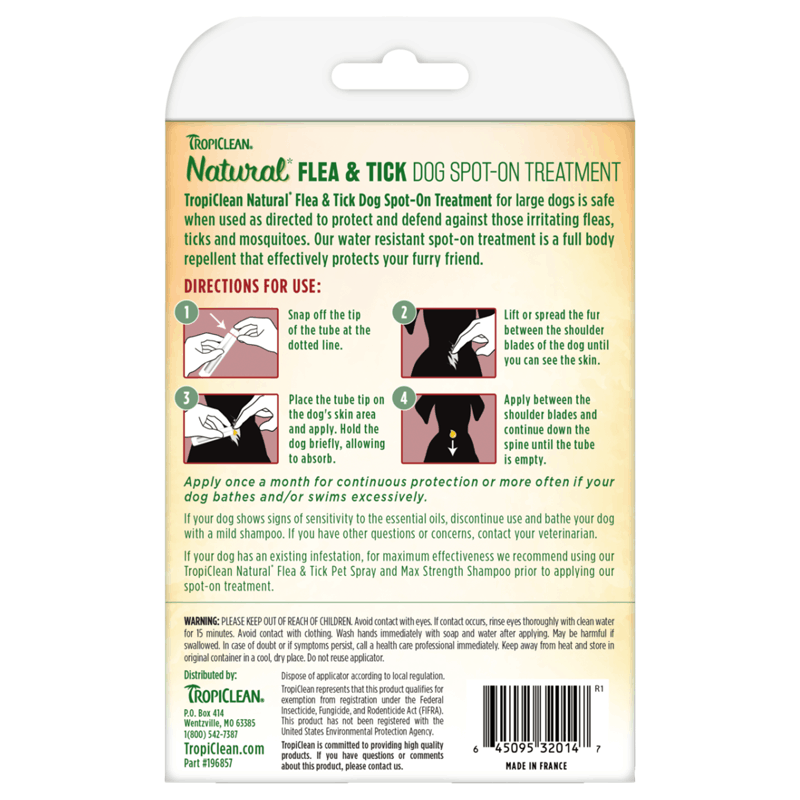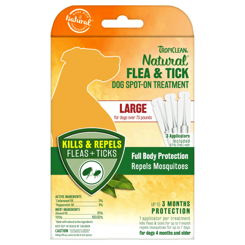 TropiClean Natural Flea & Tick Dog Spot-On Treatment for large dogs is made with natural active ingredients, cedarwood and peppermint oils, and is safe when used as directed to protect and defend against those irritating fleas, ticks and mosquitoes. Our water resistant spot-on treatment is a full body repellent for dogs over 75 pounds that effectively protects your furry friend. Contains 3 applicators.