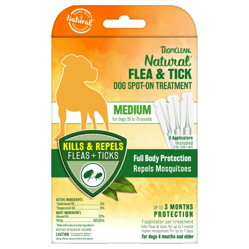 TropiClean Natural Flea & Tick Dog Spot-On Treatment for medium dogs is made with natural active ingredients, cedarwood and peppermint oils, and is safe when used as directed to protect and defend against those irritating fleas, ticks and mosquitoes. Our water resistant spot-on treatment is a full body repellent for dogs 35-75 pounds that effectively protects your furry friend. Contain 3 applicators.
