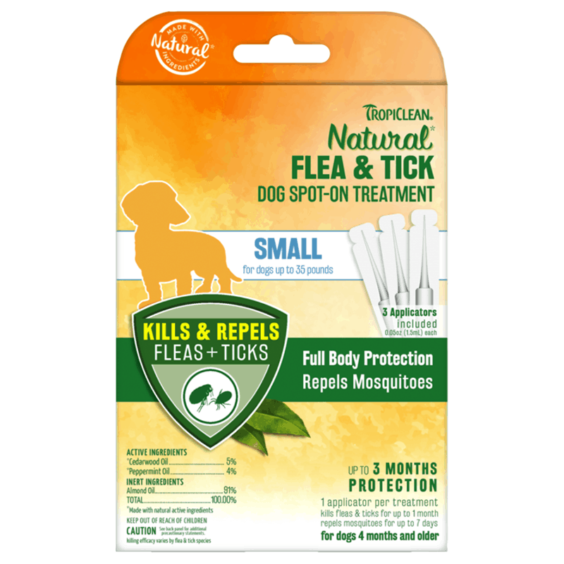 TropiClean Natural Flea & Tick Dog Spot-On Treatment for small dogs is made with natural active ingredients, cedarwood and peppermint oils, and is safe when used as directed to protect and defend against those irritating fleas, ticks and mosquitoes. Our water resistant spot-on treatment is a full body repellent for dogs up to 35 pounds that effectively protects your furry friend. Contains 4 applicators.