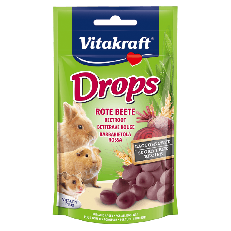 This Drops for rodents are ideal treats. Because the small bites with delicious beetroot are lactose free, they are also manufactured completely by sugar-free recipe. Your animals will love the Drops!