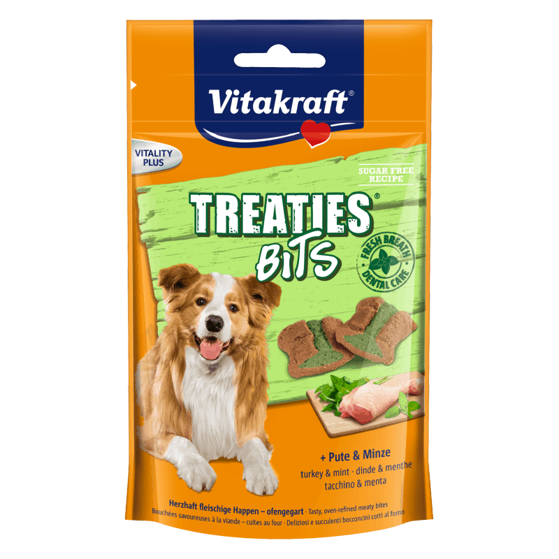 The fleshy Treaties bits with digestible turkey are produced in a unique process – with the best ingredients and to sugar-free recipe. The mouth-guard complex contained reduces the formation of tartar, mint oil also ensures a fresh dog breath.