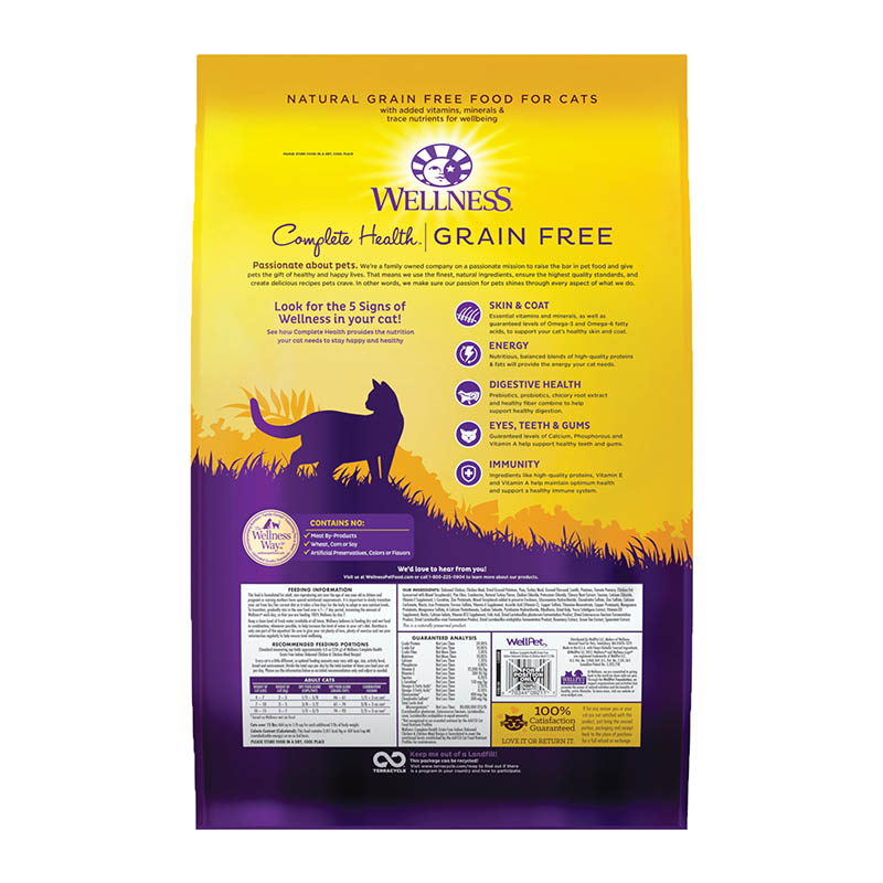 Wellness Complete Health Grain Free Indoor Chicken is specially formulated for indoor cats. This grain free, Indoor diet offers shedding support with guaranteed levels of omega fatty acids for a healthy skin and coat. L-Carnitine and fiber aid in weight management for cats with a less active lifestyle.