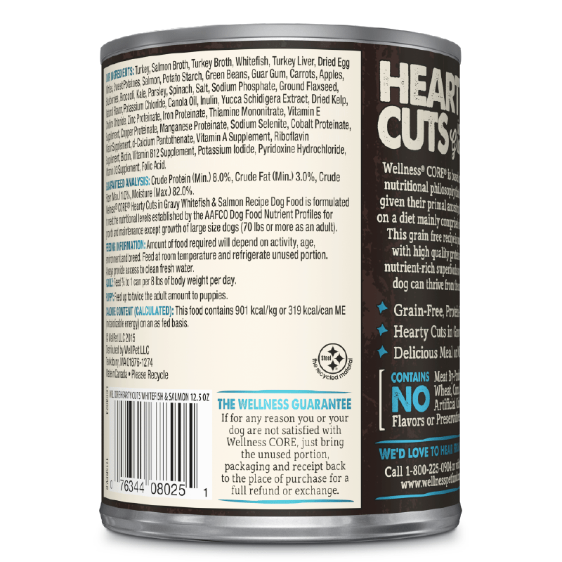 Wellness® CORE® Hearty Cuts in Gravy Whitefish & Salmon Recipe Dog Food is formulated to meet the nutritional levels established by the AAFCO Dog Food Nutrient Profiles for growth and maintenance except growth of large size dogs (70 lbs or more as an adult)