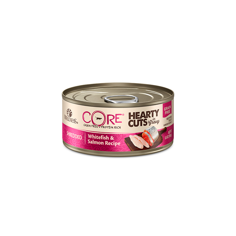 Make mealtime meatier with CORE Hearty Cuts! Thick meaty cuts of whitefish and salmon in a rich, delicious gravy mixed with superfoods such as carrots and spinach to support inner wellness.