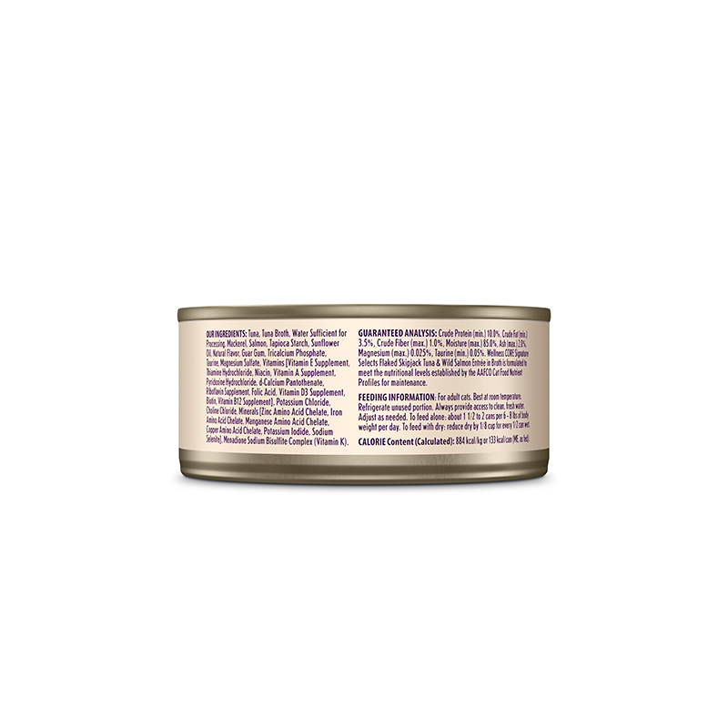 Tuna, Tuna Broth, Water Sufficient for Processing, Mackerel, Salmon, Tapioca Starch, Sunflower Oil, Natural Flavor, Guar Gum, Tricalcium Phosphate, Taurine, Magnesium Sulfate, Vitamins [Vitamin E Supplement, Thiamine Hydrochloride, Niacin, Vitamin A Supplement, Pyridoxine Hydrochloride, d-Calcium Pantothenate, Riboflavin Supplement, Folic Acid, Vitamin D3 Supplement, Biotin, Vitamin B12 Supplement, Potassium Chloride, Choline Chloride, Minerals [Zinc Amino Acid Chelate, Iron Amino Acid Chelate, Manganese Amino Acid Chelate, Copper Amino Acid Chelate, Potassium Iodide, Sodium Selenite], Menadione Sodium Bisulfite Complex (Vitamin K).