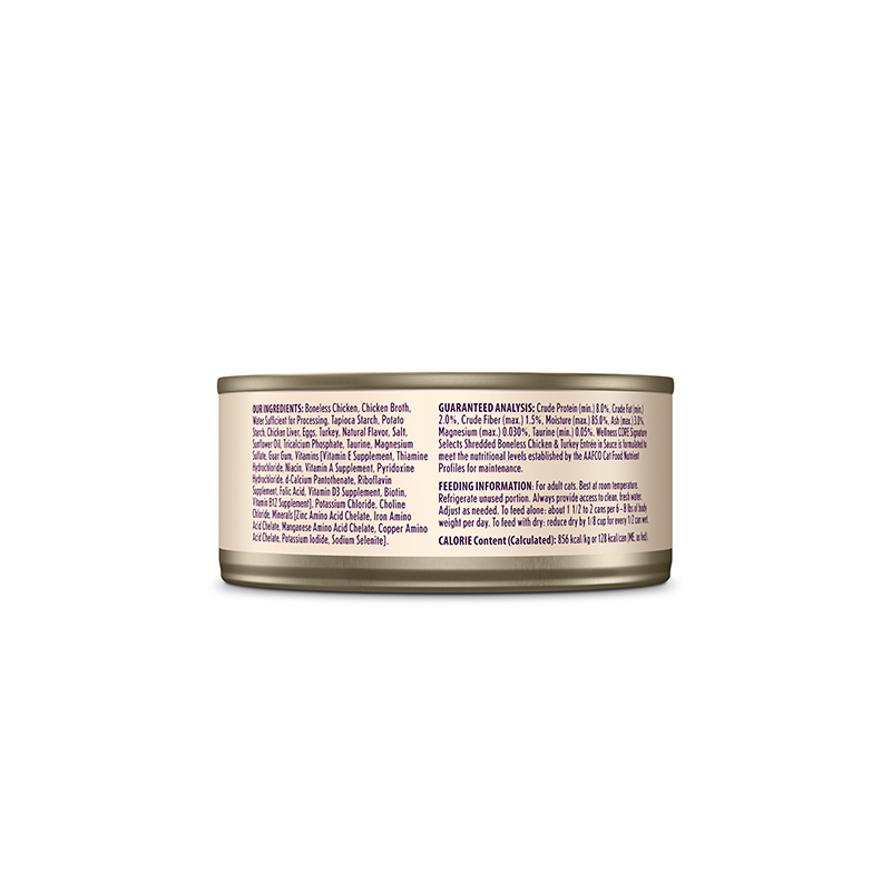 Boneless Chicken, Chicken Broth, Water Sufficient for Processing, Potato Starch, Eggs, Turkey, Natural Flavor, Tricalcium Phosphate, Sunflower Oil, Guar Gum, Potassium Chloride, Taurine, Salt, Magnesium Sulfate, Xanthan Gum, Vitamins [Vitamin E Supplement, Thiamine Hydrochloride, Niacin, Vitamin A Supplement, Pyridoxine Hydrochloride, d-Calcium Pantothenate, Riboflavin Supplement, Folic Acid, Vitamin D3 Supplement, Biotin, Vitamin B12 Supplement], Choline Chloride, Minerals [Zinc Amino Acid Chelate, Iron Amino Acid Chelate, Manganese Amino Acid Chelate, Copper Amino Acid Chelate, Potassium Iodide, Sodium Selenite]