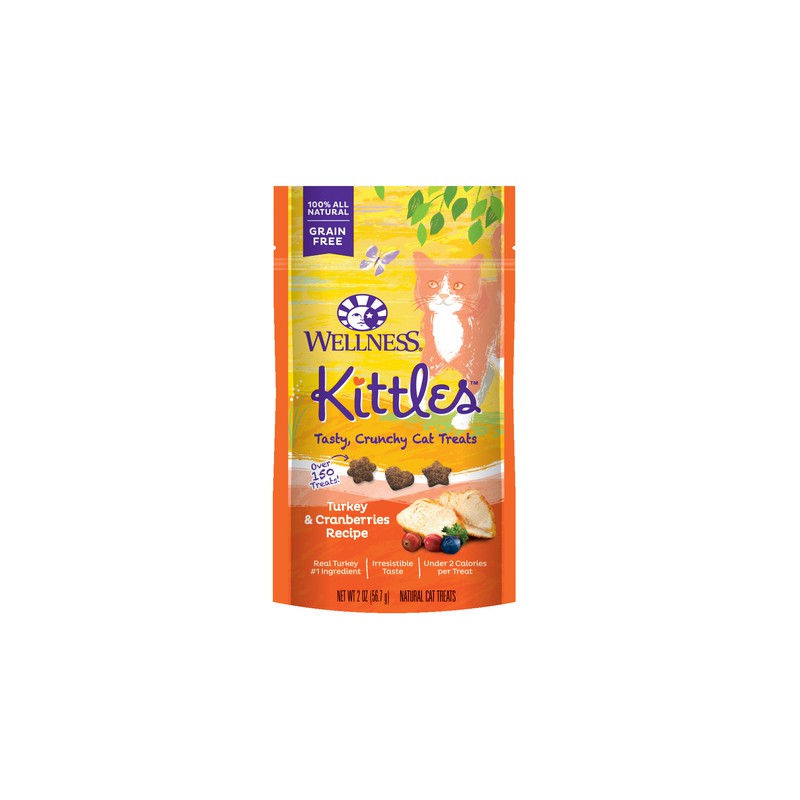 Indulge your cat with Wellness® Kittles™ natural, grain-free crunchy cat treats. At only 2 calories per treat, Kittles are the purrfect way to show your kitty love. With 6 flavors to choose from, these crunchy bites are not only delicious, but help clean teeth too!