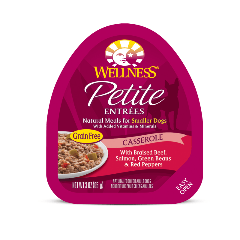 HomeDogsFoodWet Food Wellness Petite Entrées Casserole Braised Beef, Salmon, Green Beans & Red Peppers Cup Tray Small Breed Wet Dog Food 3oz