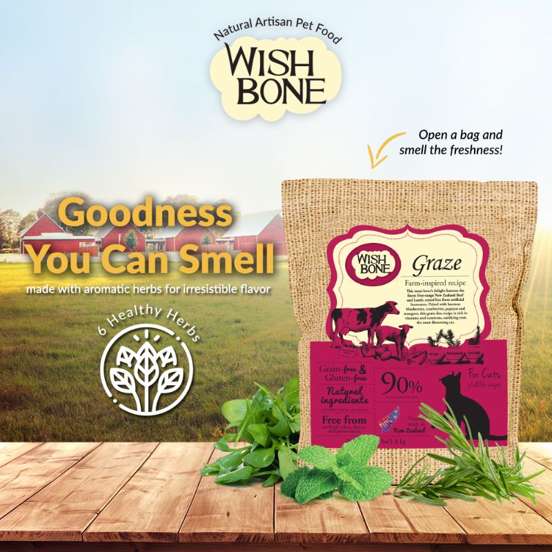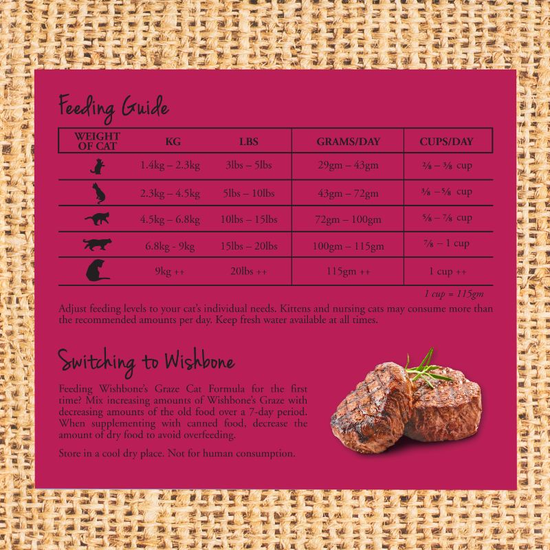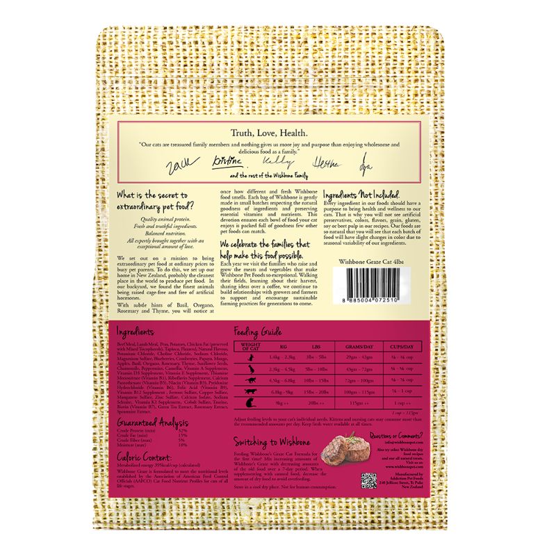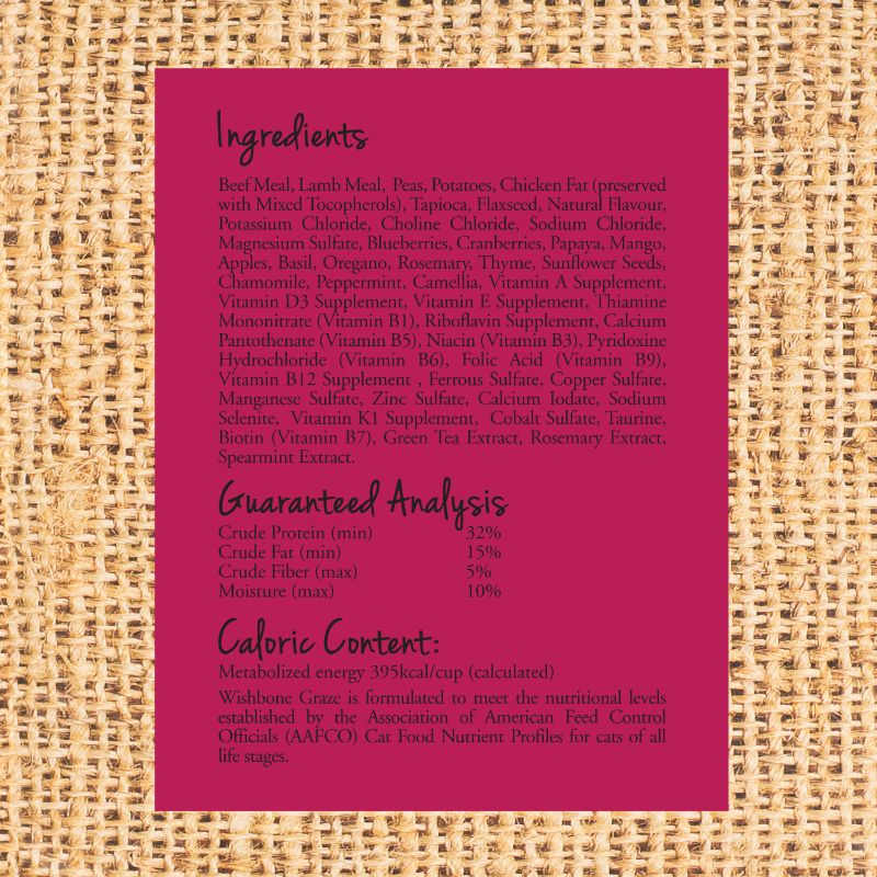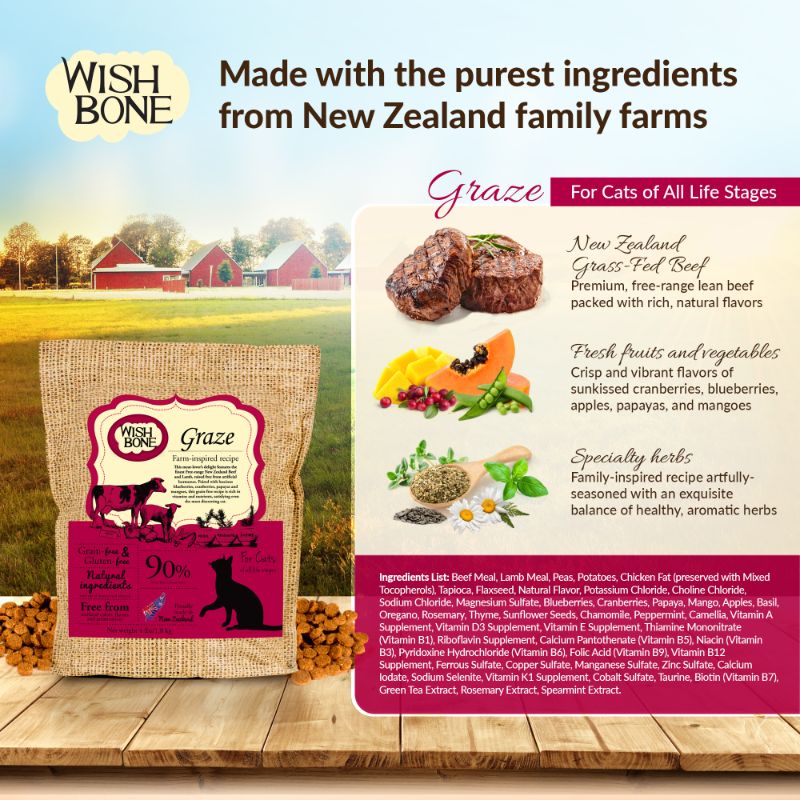 Wishbone Graze dry cat food features the finest free-range New Zealand Beef and Lamb, raised free from artificial hormones.