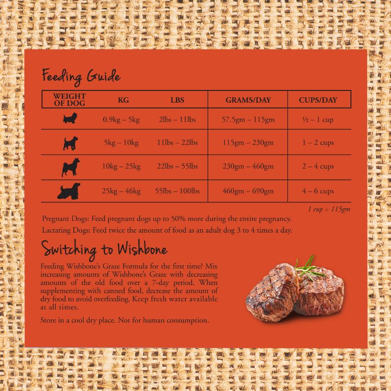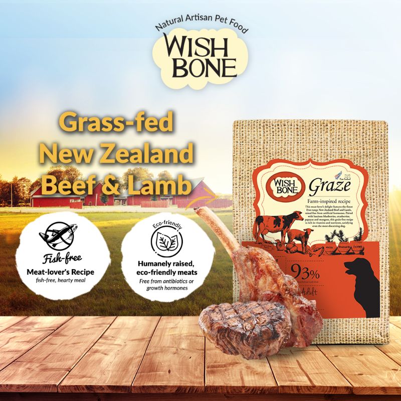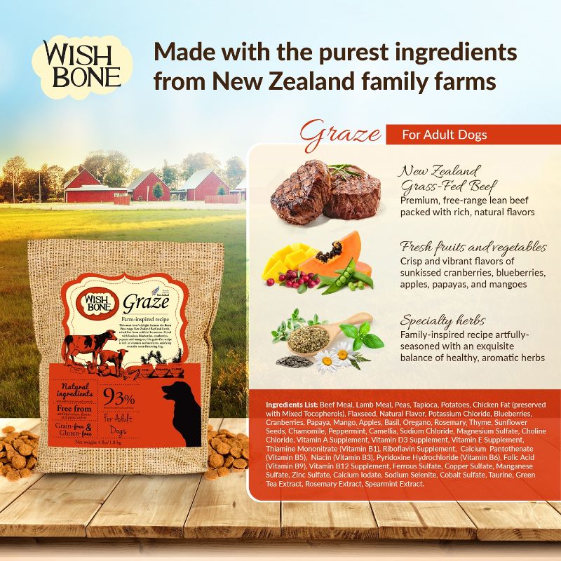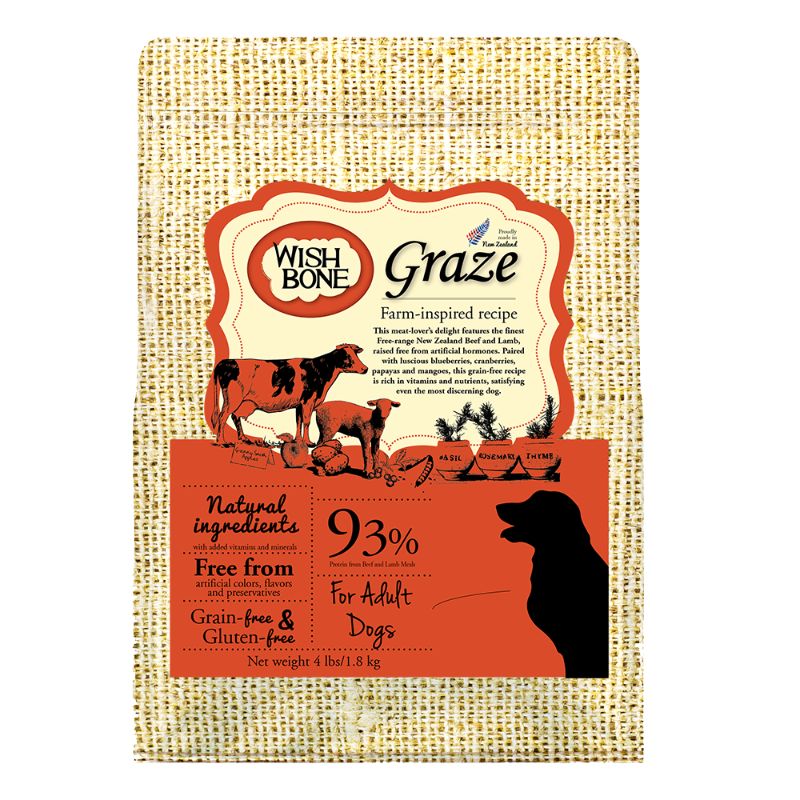 Wishbone Graze Grain-Free Dry Dog Food features the finest free-range New Zealand Beef and Lamb, raised free from artificial hormones. Paired with luscious blueberries, cranberries, papayas and mangoes, this grain-free recipe is rich in vitamins and nutrients, satisfying even the most discerning dog.