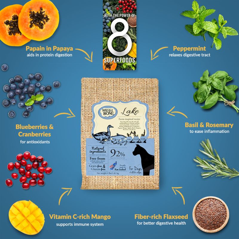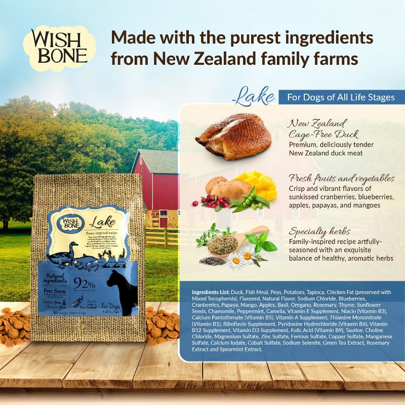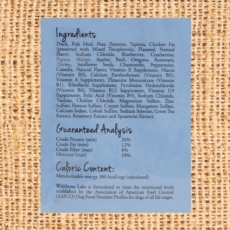 Wishbone Lake Grain-Free Dry Dog Food provides advanced nutrition to help avoid allergic reactions caused by common pet food ingredients. Only premium proteins and natural ingredients are used including savory duck, farm-fresh berries, tropical fruits and herbal botanicals for a satisfying meal that’s full of flavor. There are no fillers or by-products, meaning you’ll find a greater concentration of beneficial nutrients in this deliciously healthy dry food.