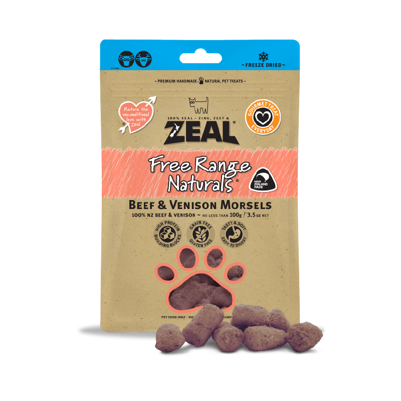 ZEAL® 100% Pure Natural pet treats are wholesome, trustworthy and traceable to source. Our large range of treats includes 6 varieties of delicious freeze dried treats which cats and dogs both love~ Lamb & Venison Morsels, Chicken & Beef Morsels, Lamb & Salmon Morsels, Beef & Venison Morsels, Chicken & Lamb Morsels, and Green Lipped Mussels. These are perfect for training, a quick reward, or even to crumble on top of food as a topper! Our treats are made from premium New Zealand free range meats and wild caught seafood. Absolutely NO colourings, flavours, additives or preservatives are used in the manufacturing process. Treat your pets with a tasty and healthy source of nutrients.