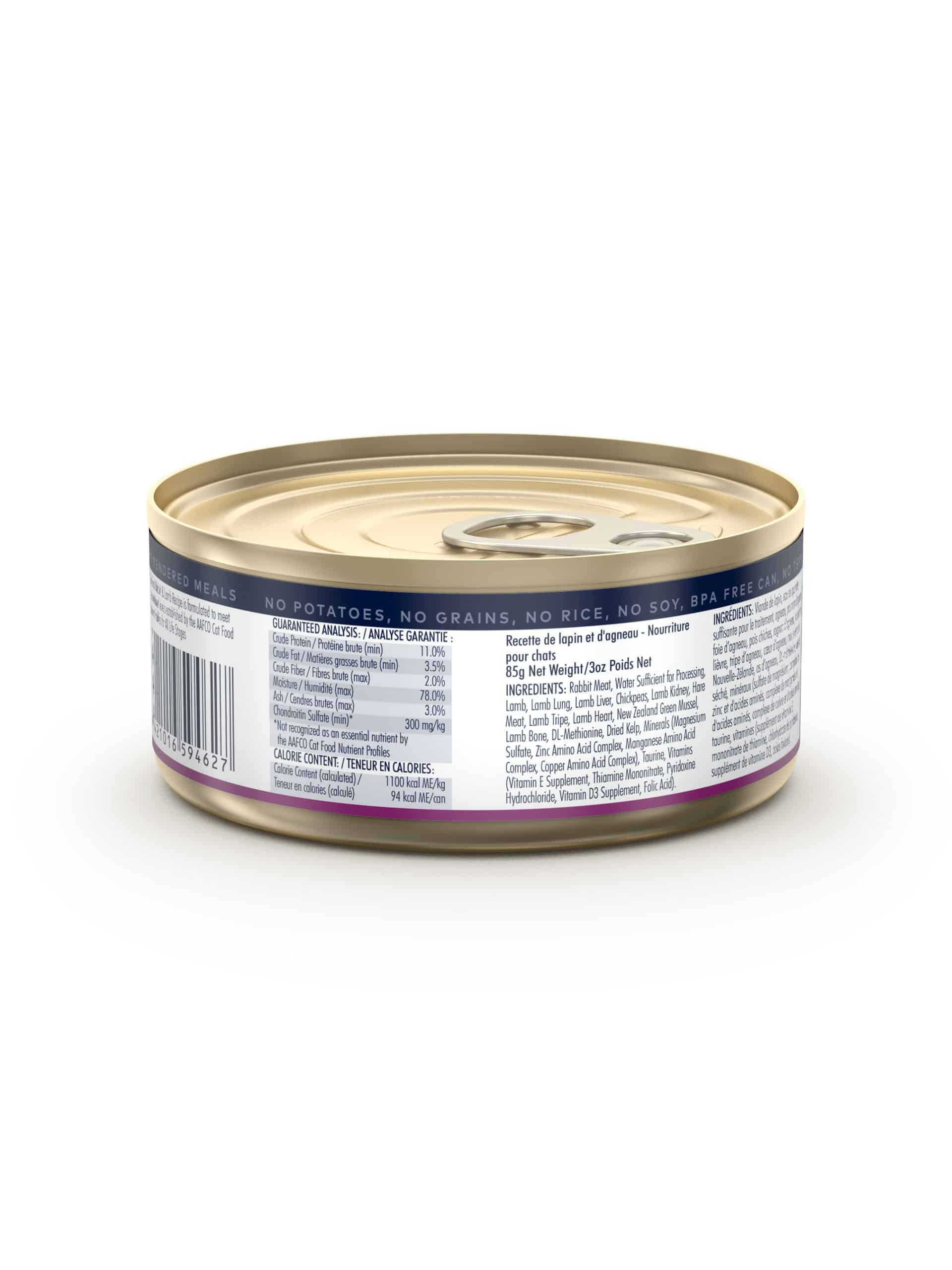A combination of lean, wild New Zealand Rabbit and Lamb sourced only from local New Zealand farms, ensuring the animals are free-ranging, grass-fed and finished. This recipe contains minced whole rabbit, including bone, mirroring the natural, whole-prey diet of cats in the wild.