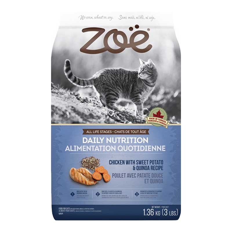 Zoë’s dry cat food formula combines grains like quinoa with low glycemic sweet potato and rich sources of omega fatty acids, flaxseeds, chia seeds and salmon oil to keep your cat’s coat soft and shiny. And to help make sure your pet lives a long and healthy life our food is rich in antioxidants, phytonutrients, and essential vitamins and minerals. Zoë cat food, made in Canada and just as natural.