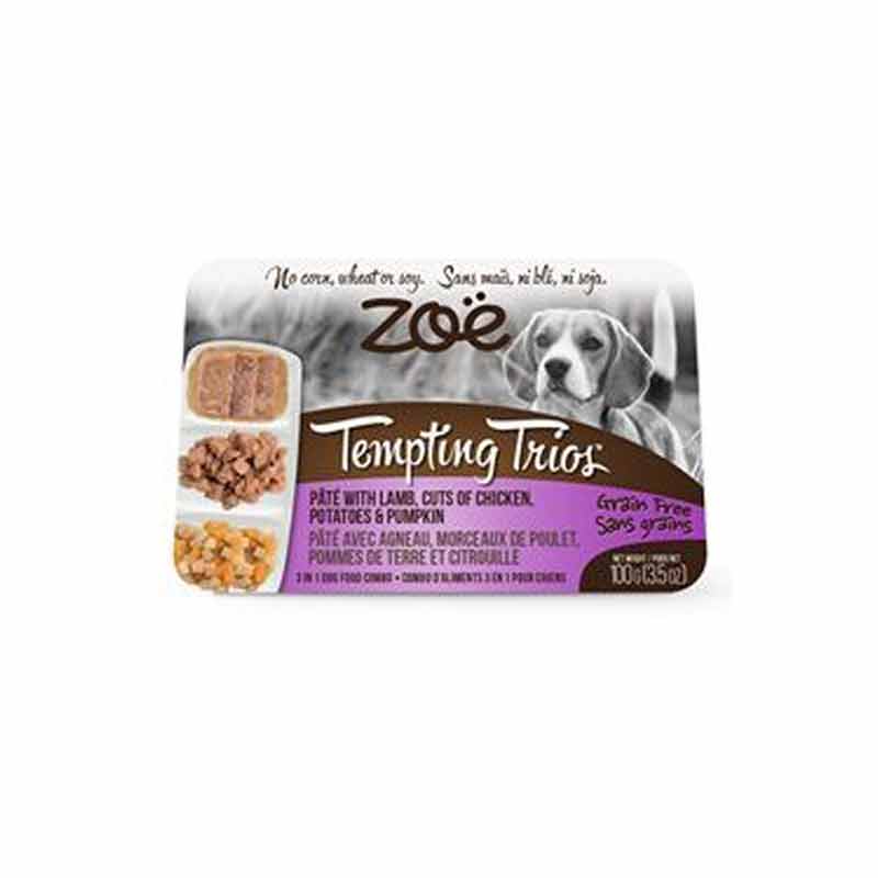Zoë’s Tempting Trios wet dog food combines three different taste sensations in one tray. Savory pâté with lamb, tasty chicken chunks and a blend of fresh potatoes and pumpkins.