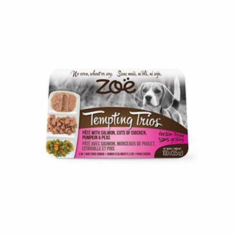 Zoë’s Tempting Trio wet dog food combines three different taste sensations in one tray. Savory pâté with salmon, tasty chicken chunks and a blend of fresh pumpkins potatoes and green peas.